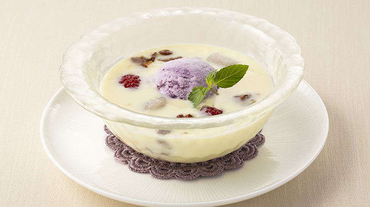 べにはるかの冷たいお汁粉、紫芋アイス添え